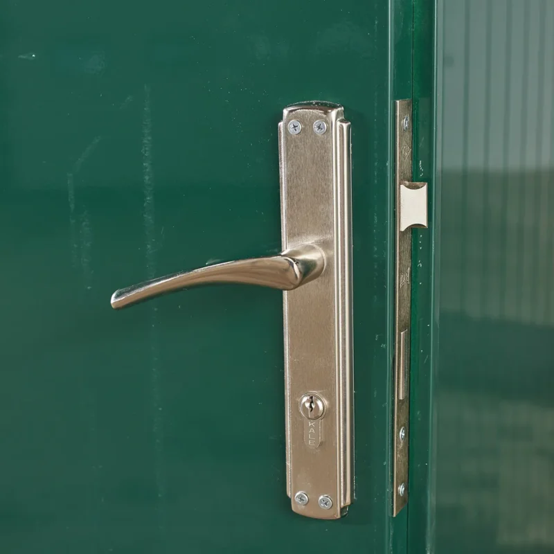 Diese flach verpackte Kabine wird aus vollständig verzinktem Stahl gefertigt (rostfrei) und verfügt über eine attraktive, glatte Verkleidung, die außen mit einer moosgrünen Pulverbeschichtung und innen mit einer cremeweißen Pulverbeschichtung versehen ist.
