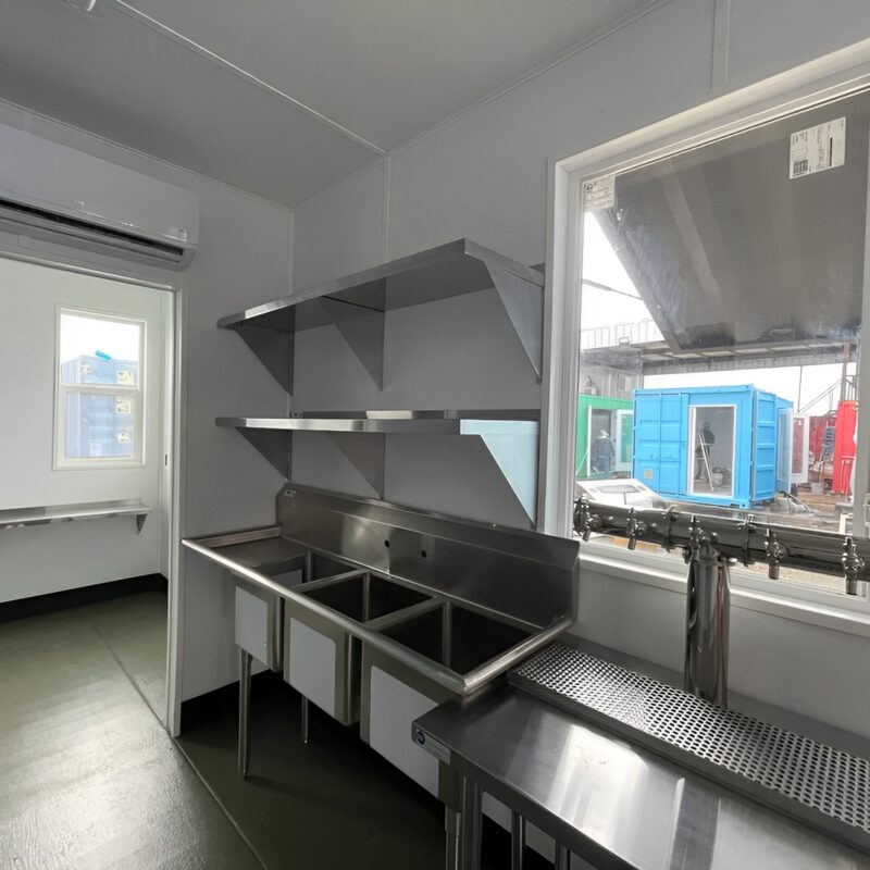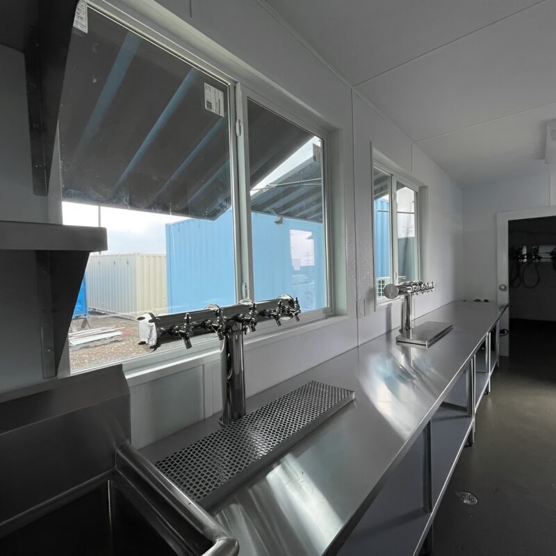 Diese High-Cube-Einheit verfügt über einen speziell eingerichteten Fasslagerraum , einen geräumigen Bar- und Servierbereich sowie einen praktischen Ticketschalter – allesamt ausgestattet mit professionellen Geräten, Edelstahlarmaturen, integrierter Kühlung und ausziehbaren Serviertheken. Von den eleganten, vertikal zu öffnenden Fenstern über die Epoxidharzböden bis hin zur LED-Beleuchtung ist jeder Zentimeter auf effizienten Service und ansprechendes Design ausgelegt.