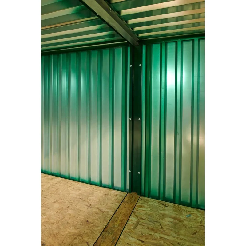 Das Aneinanderreihen von flach verpackten Lagerbehältern ist eine schnelle und einfache Methode, um Stauraum für lange Materiallängen zu schaffen. Zwei miteinander verbundene, jeweils 4 m lange, grün pulverbeschichtete Behälter ergeben eine Innenlänge von 7,56 m.