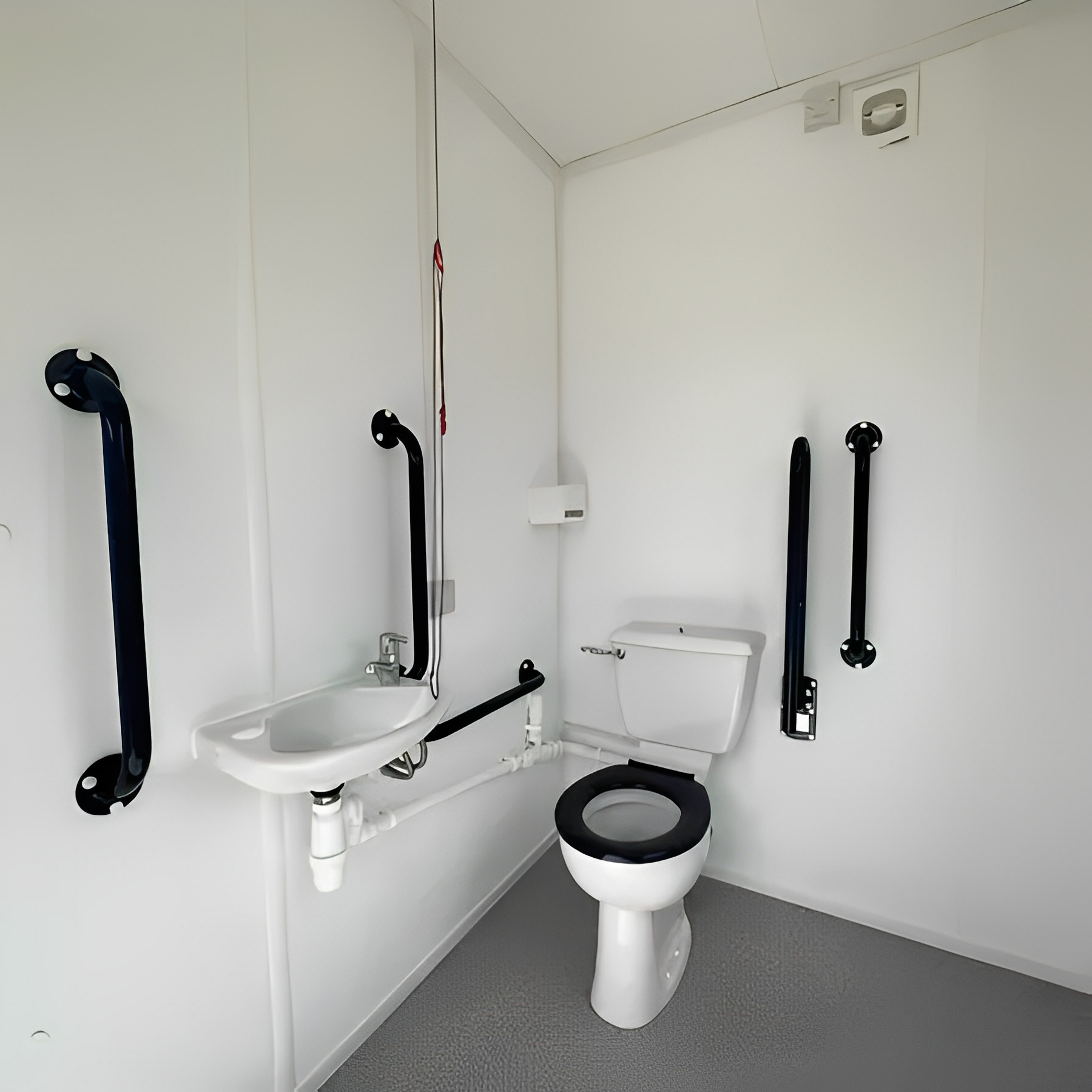 9,75 m lange, maßgefertigte Bürokabine/Kantine mit barrierefreiem WC