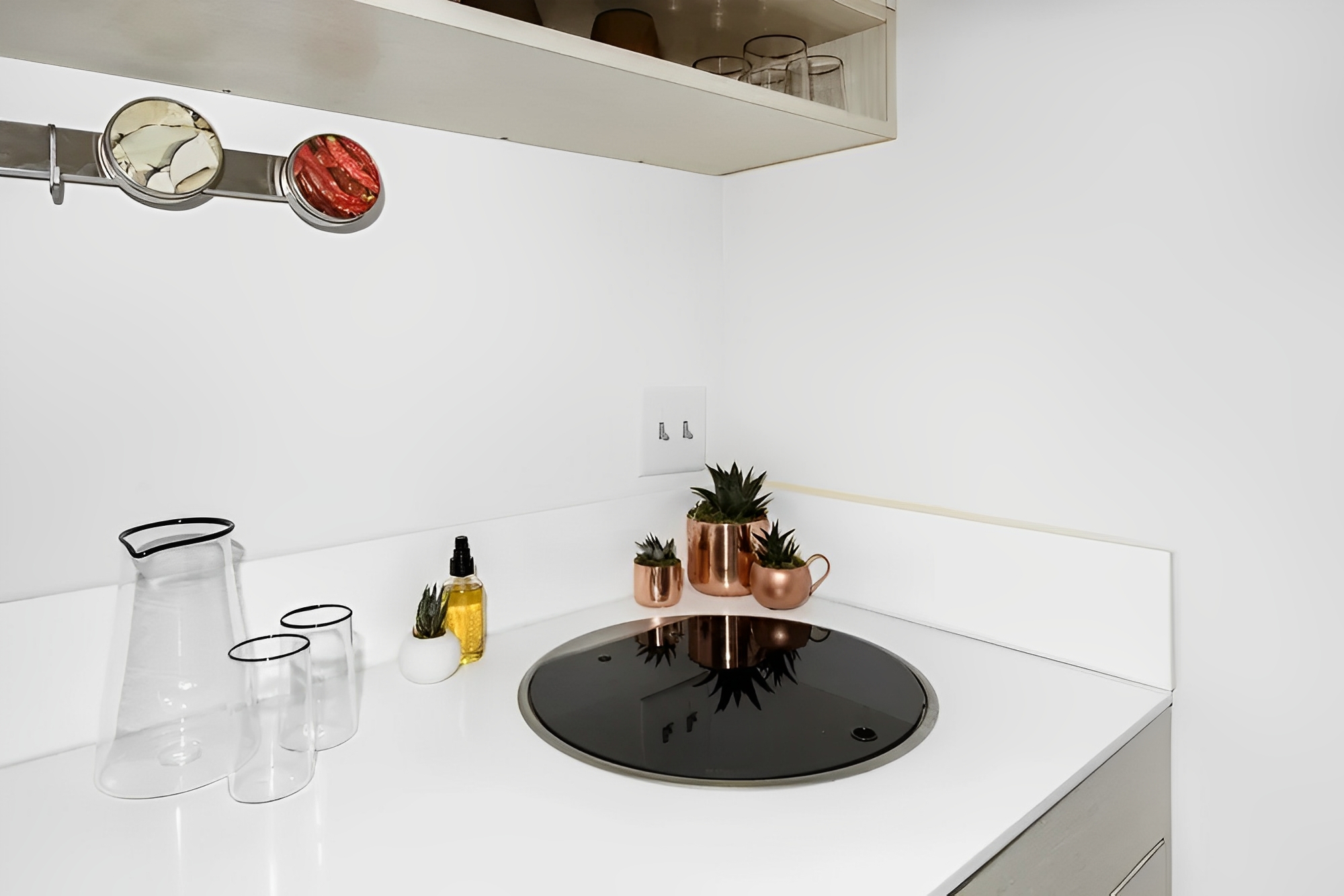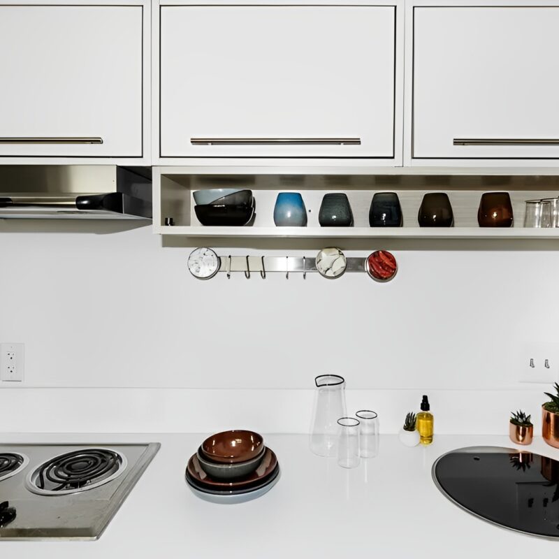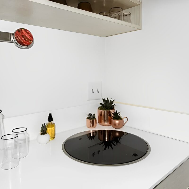 Intelligente Geräte – Mitsubishi Mini-Split-Wärmepumpe, Durchlauferhitzer, Dometic Konvektionsofen/Mikrowelle, 2-Flammen-Elektroherd und Unterbaukühlschrank.